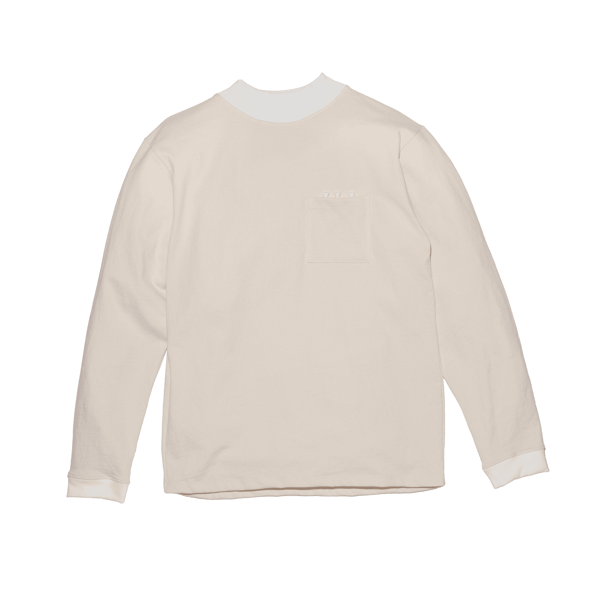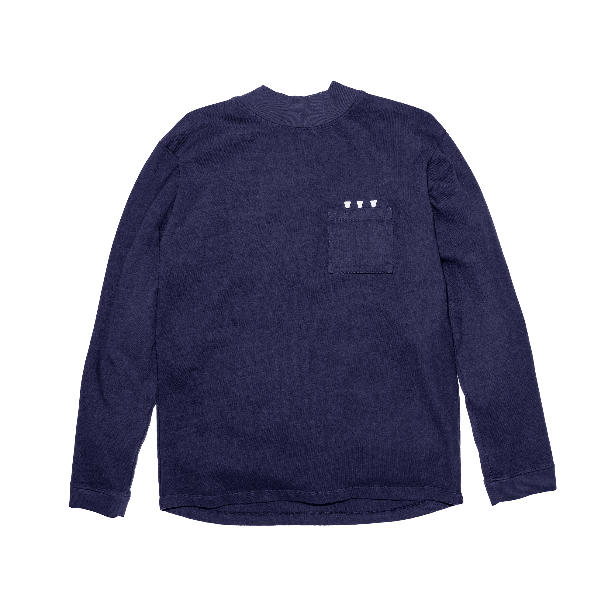 100% cotton heavyweight long-sleeve mock neck. Cotton rib for mock neck collar and wrist cuffs. Chest pocket with a hidden tee holder (holds up to 3 tees). Slightly curved hem to make it easier to tuck in. Tonal logo embroidery on the back.